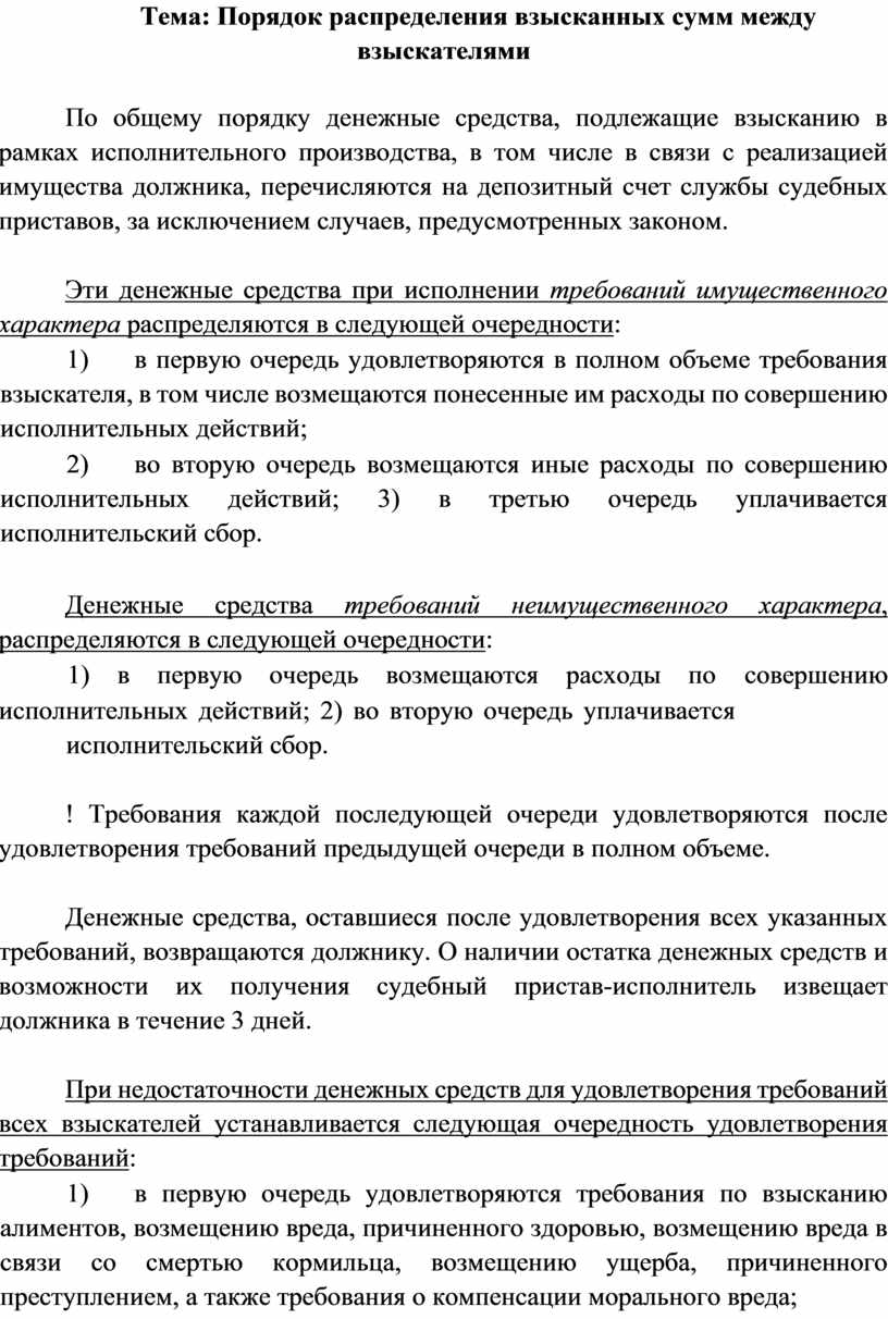 Эти денежные средства при исполнении требований имущественного характера распределяются в следующей очередности: