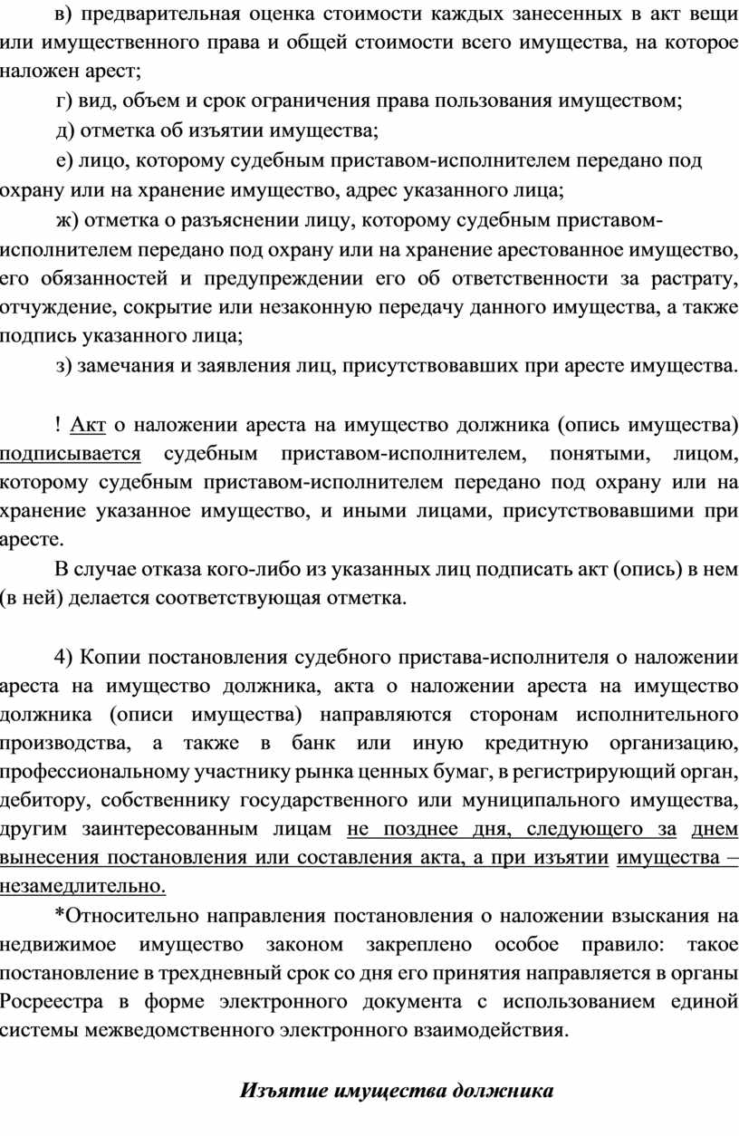 2) элемент ареста имущества должника (ст. 80 ФЗИП) (в данном случае изъятие имущества должника не является обязательным элементом ареста и применяется исключительно в зависимости от конкретного случая по усмотрению судебного пристава-исполнителя).