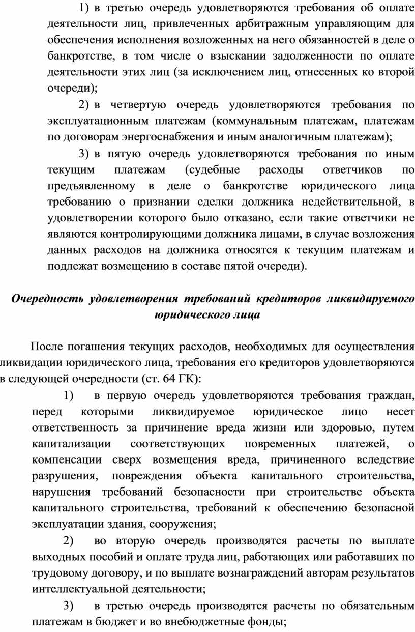После погашения текущих расходов, необходимых для осуществления ликвидации юридического лица, требования его кредиторов удовлетворяются в следующей очередности (ст. 64 ГК):