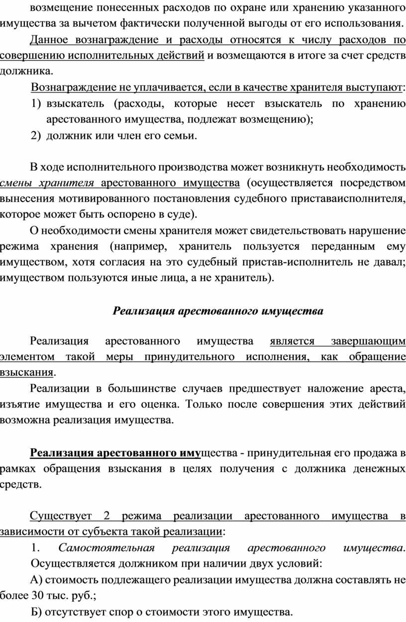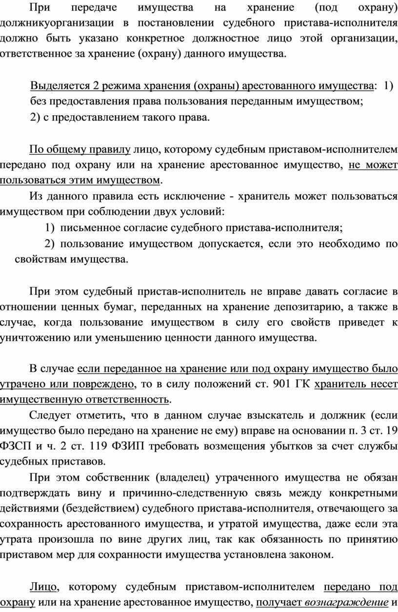 исполнителем передано под охрану или на хранение арестованное имущество, его обязанностей и предупреждении его об ответственности за растрату, отчуждение, сокрытие или незаконную передачу данного имущества, а также подпись указанного лица;