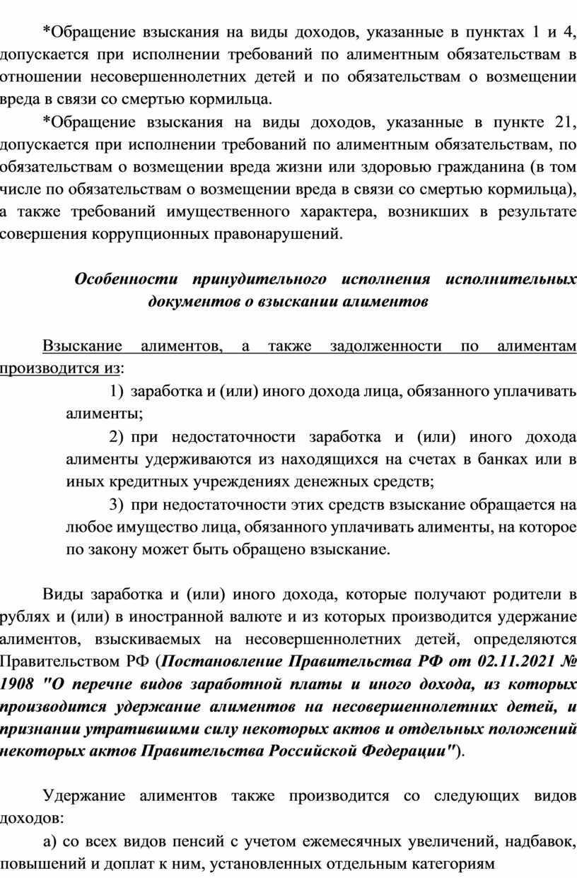 Виды заработка и (или) иного дохода, которые получают родители в рублях и (или) в иностранной валюте и из которых производится удержание алиментов, взыскиваемых на несовершеннолетних детей, определяются Правительством РФ (Постановление Правительства РФ от 02.11.2021 № 1908 "О перечне видов заработной платы и иного дохода, из которых производится удержание алиментов на несовершеннолетних детей, и признании утратившими силу некоторых актов и отдельных положений некоторых актов Правительства Российской Федерации").