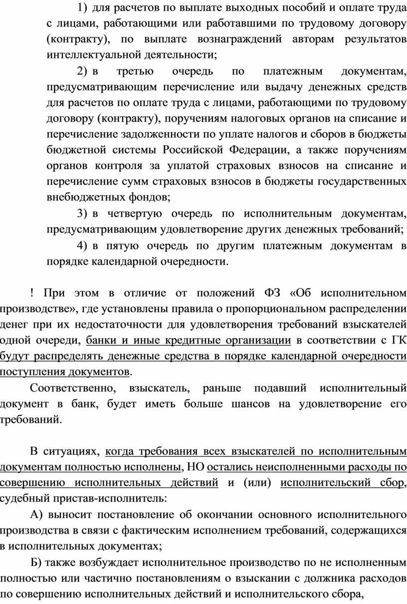 ! При этом в отличие от положений ФЗ «Об исполнительном производстве», где установлены правила о пропорциональном распределении денег при их недостаточности для удовлетворения требований взыскателей одной очереди, банки и иные кредитные организации в соответствии с ГК будут распределять денежные средства в порядке календарной очередности поступления документов.