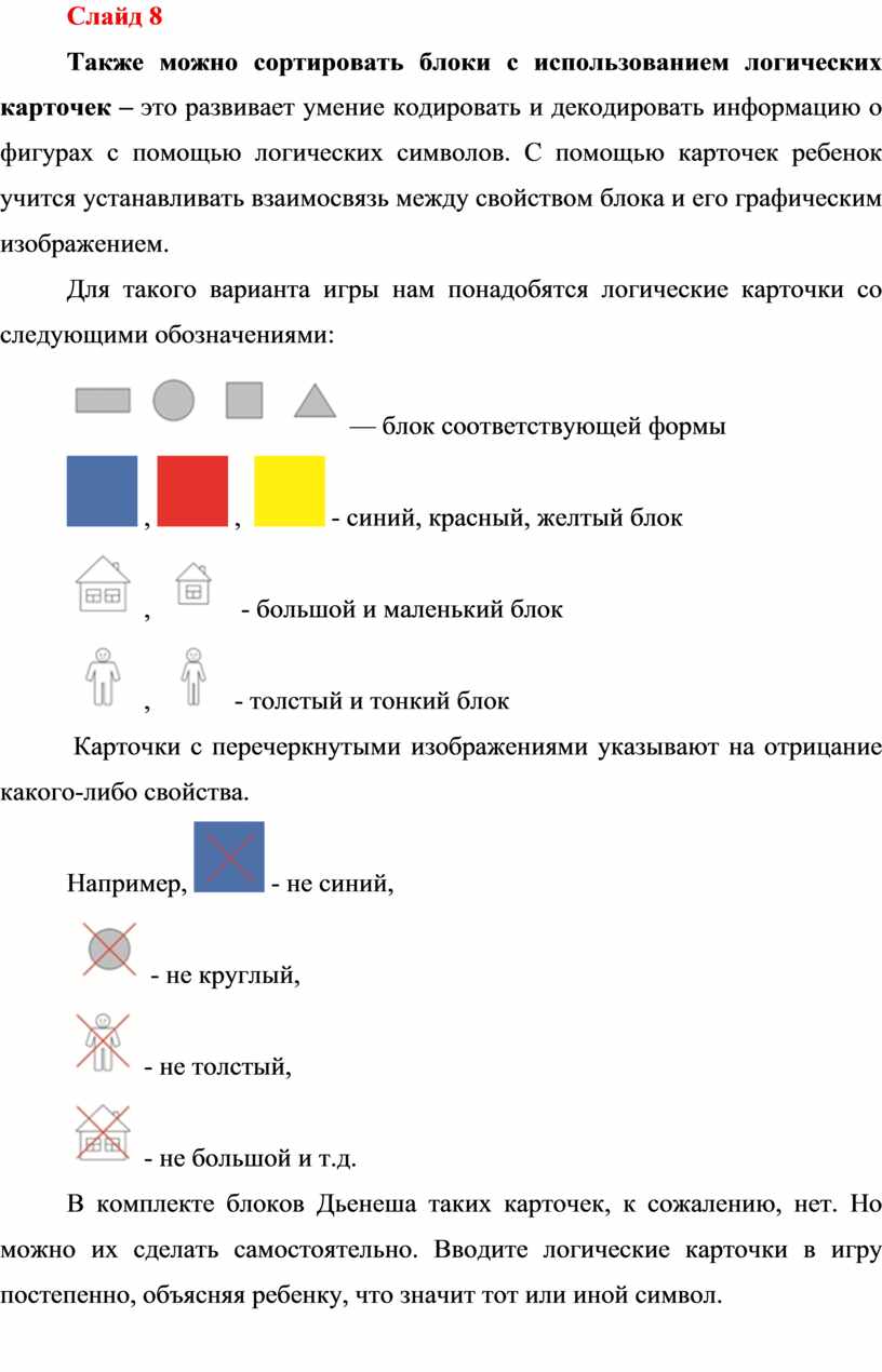 Также можно сортировать блоки с использованием логических карточек – это развивает умение кодировать и декодировать информацию о фигурах с помощью логических символов. С помощью карточек ребенок учится устанавливать взаимосвязь между свойством блока и его графическим изображением.
