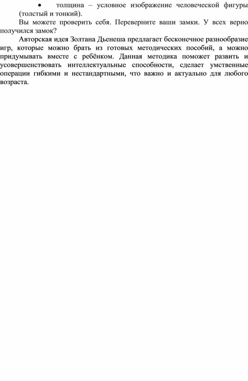 Авторская идея Золтана Дьенеша предлагает бесконечное разнообразие игр, которые можно брать из готовых методических пособий, а можно придумывать вместе с ребёнком. Данная методика поможет развить и усовершенствовать интеллектуальные способности, сделает умственные операции гибкими и нестандартными, что важно и актуально для любого возраста.