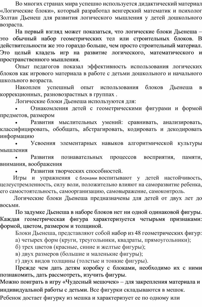 Во многих странах мира успешно используется дидактический материал «Логические блоки», который разработал венгерский математик и психолог Золтан Дьенеш для развития логического мышления у детей дошкольного возраста.