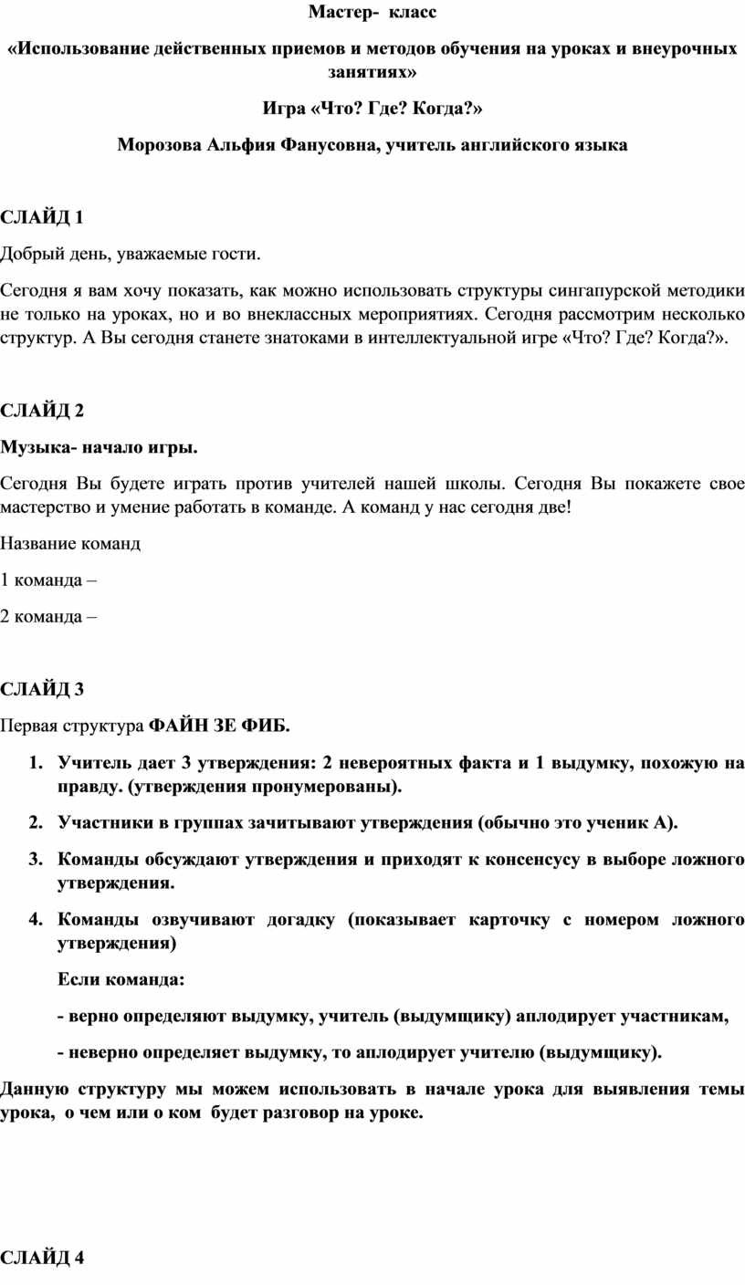 Сегодня я вам хочу показать, как можно использовать структуры сингапурской методики не только на уроках, но и во внеклассных мероприятиях. Сегодня рассмотрим несколько структур. А Вы сегодня станете знатоками в интеллектуальной игре «Что? Где? Когда?».
