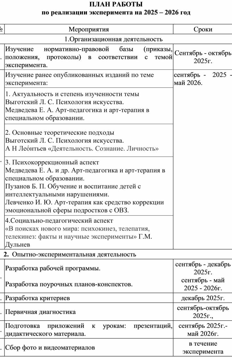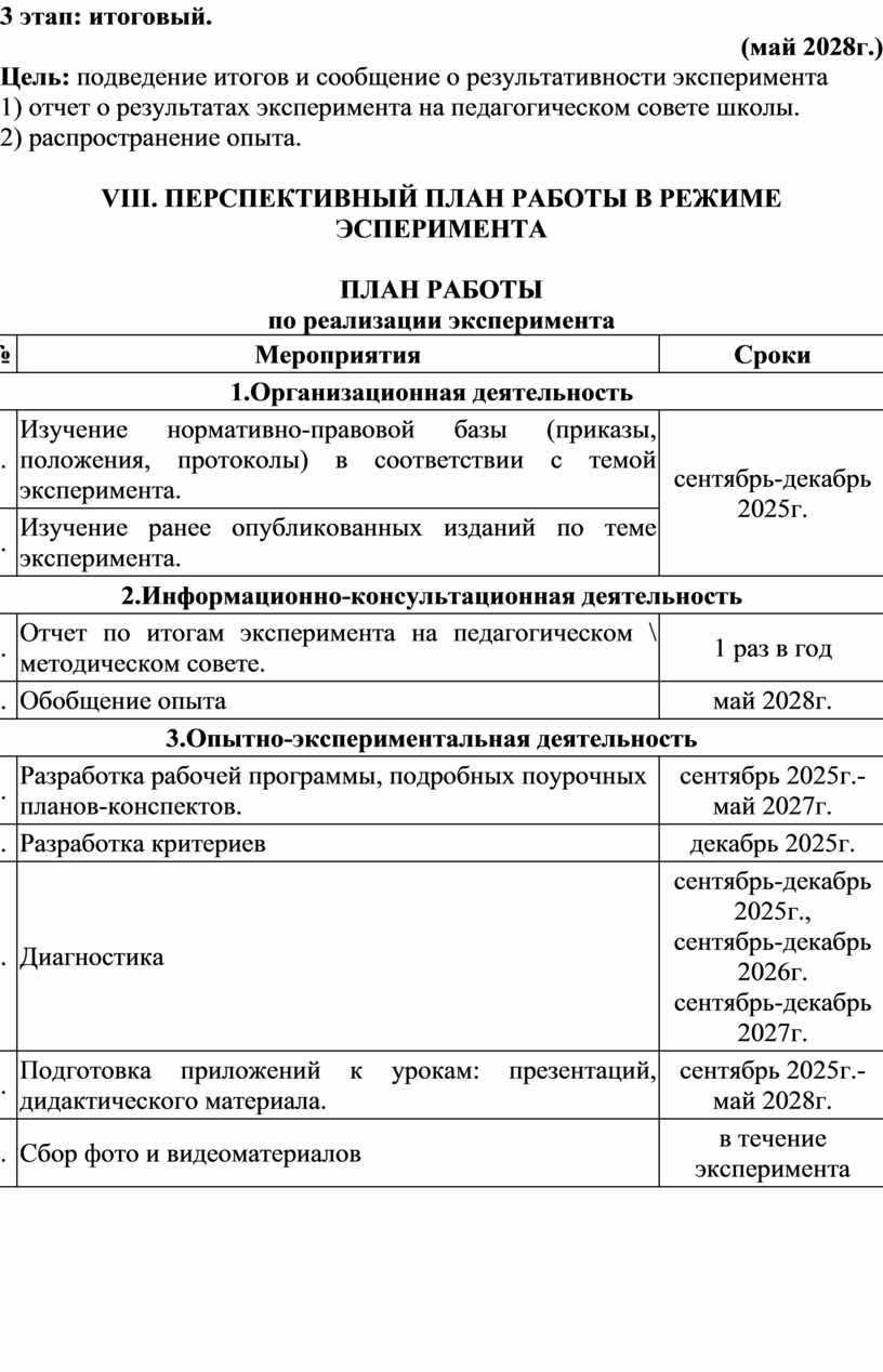VIII. ПЕРСПЕКТИВНЫЙ ПЛАН РАБОТЫ В РЕЖИМЕ ЭСПЕРИМЕНТА