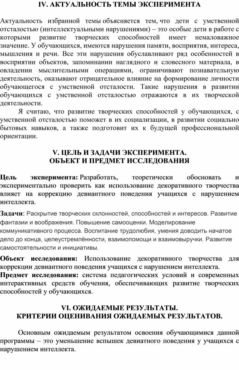 Разработать, теоретически обосновать и экспериментально проверить как использование декоративного творчества влияет на коррекцию девиантного поведения учащихся с нарушением интеллекта. |