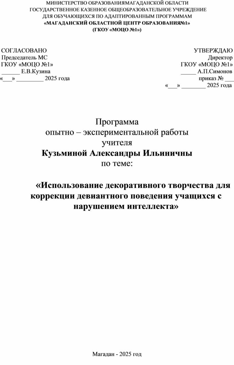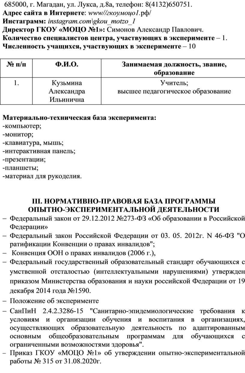 - Приказ ГКОУ «МОЦО №1» об утверждении опытно-экспериментальной работы № 315 от 31.08.2020г.
