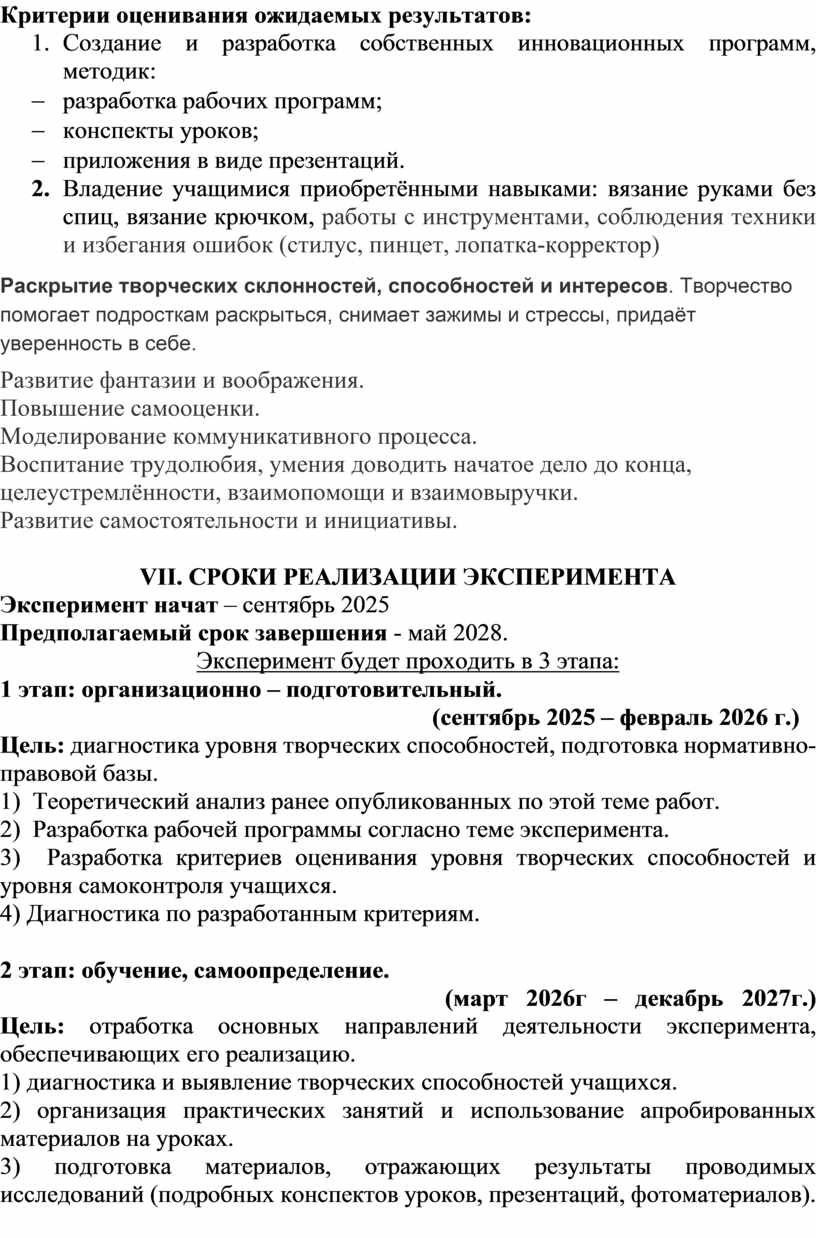VII. СРОКИ РЕАЛИЗАЦИИ ЭКСПЕРИМЕНТА