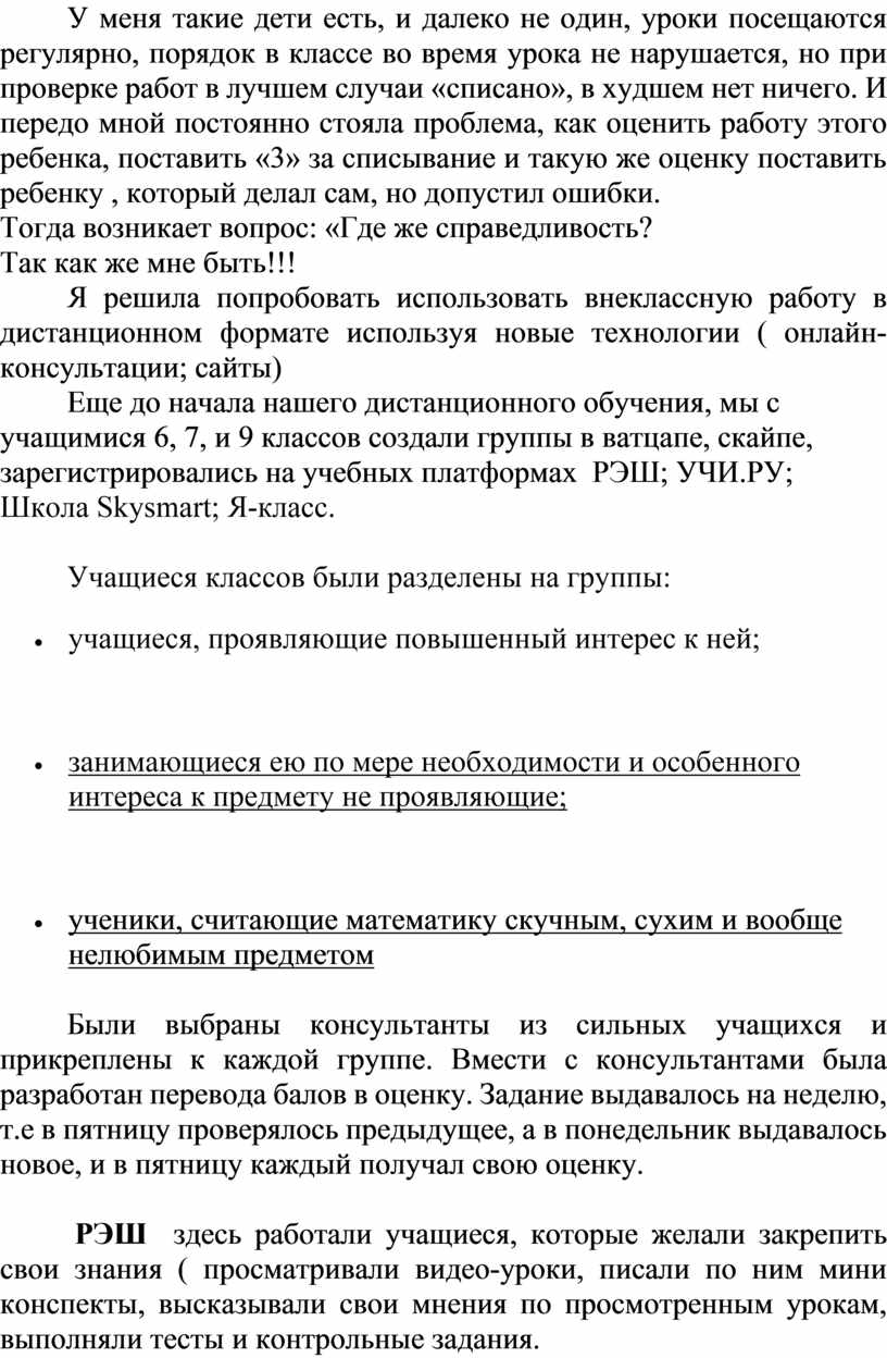 Еще до начала нашего дистанционного обучения, мы с учащимися 6, 7, и 9 классов создали группы в ватцапе, cкайпе, зарегистрировались на учебных платформах РЭШ; УЧИ.РУ; Школа Skysmart; Я-класс.
