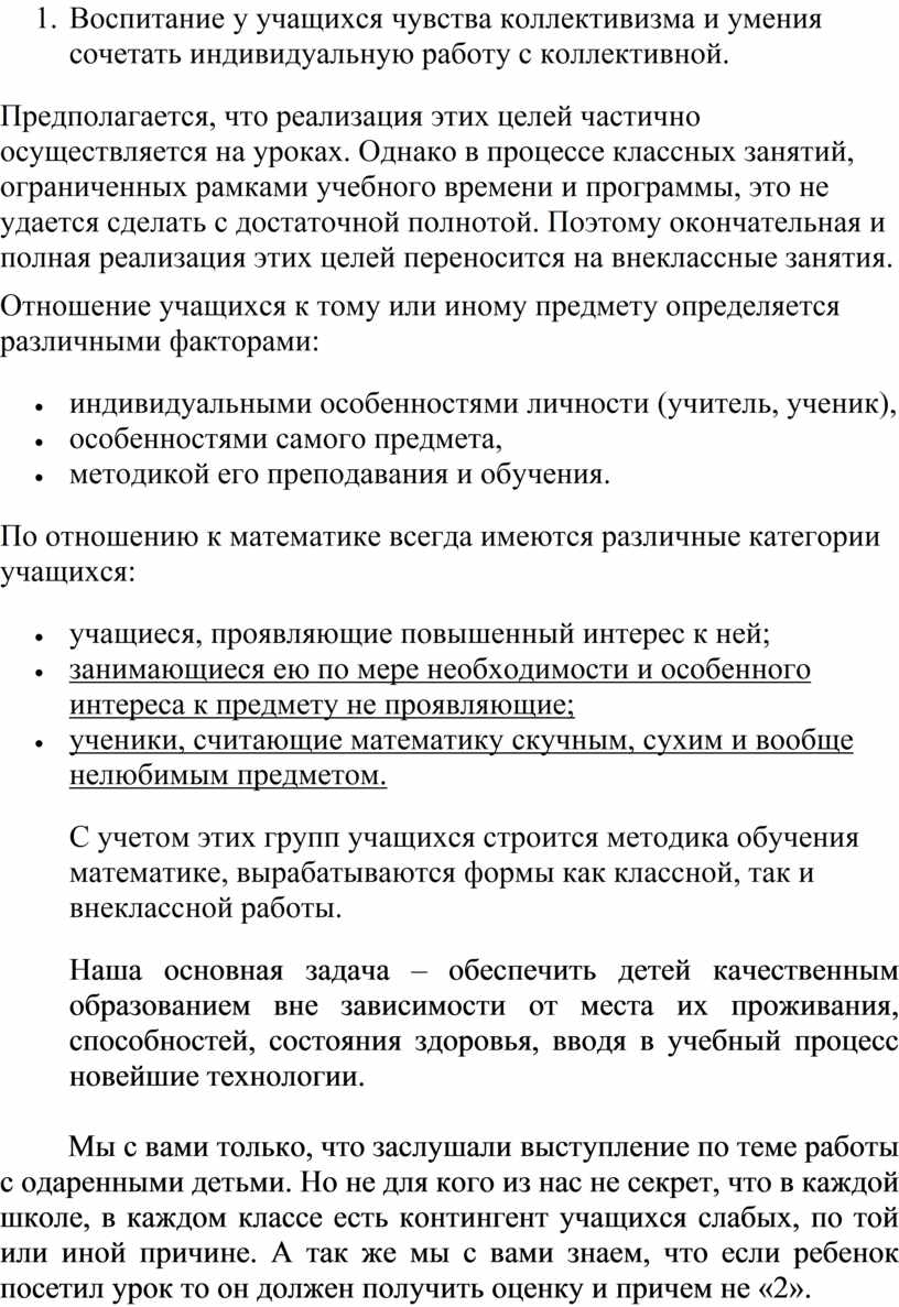 С учетом этих групп учащихся строится методика обучения математике, вырабатываются формы как классной, так и внеклассной работы.