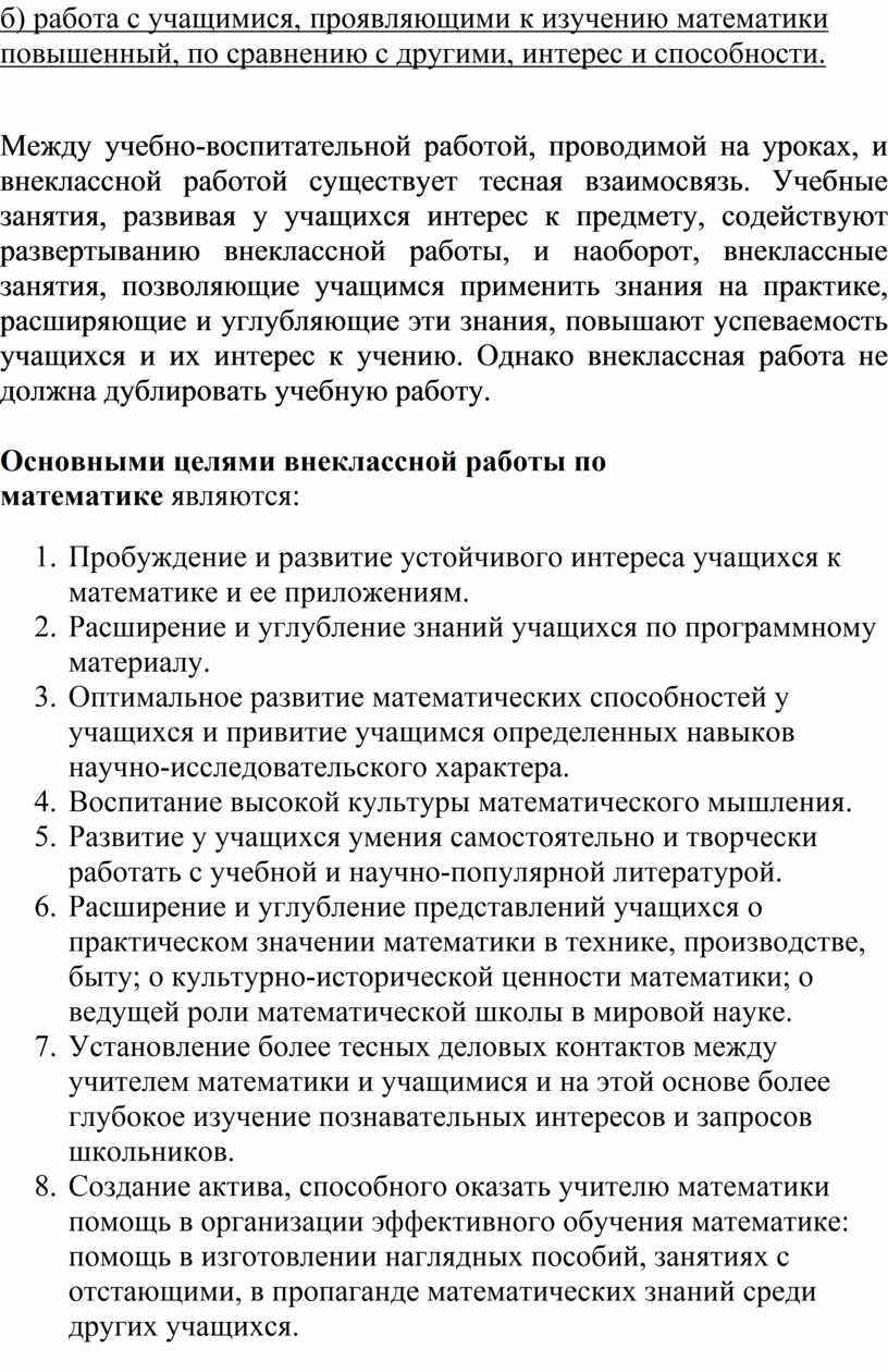 б) работа с учащимися, проявляющими к изучению математики повышенный, по сравнению с другими, интерес и способности.