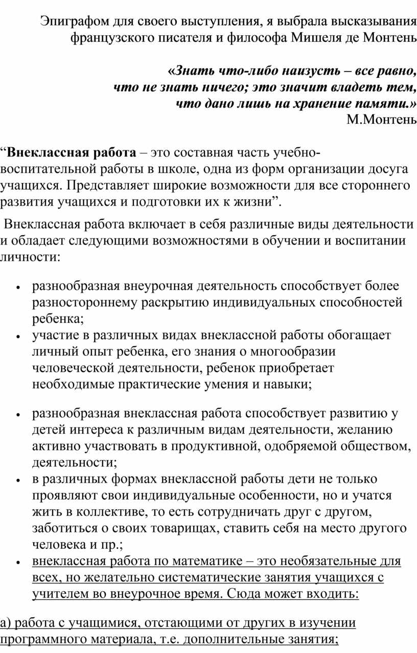 “Внеклассная работа – это составная часть учебно-воспитательной работы в школе, одна из форм организации досуга учащихся. Представляет широкие возможности для все стороннего развития учащихся и подготовки их к жизни”.