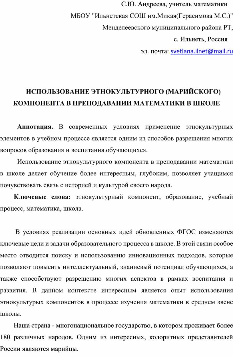 ИСПОЛЬЗОВАНИЕ ЭТНОКУЛЬТУРНОГО (МАРИЙСКОГО) КОМПОНЕНТА В ПРЕПОДАВАНИИ МАТЕМАТИКИ В ШКОЛЕ
