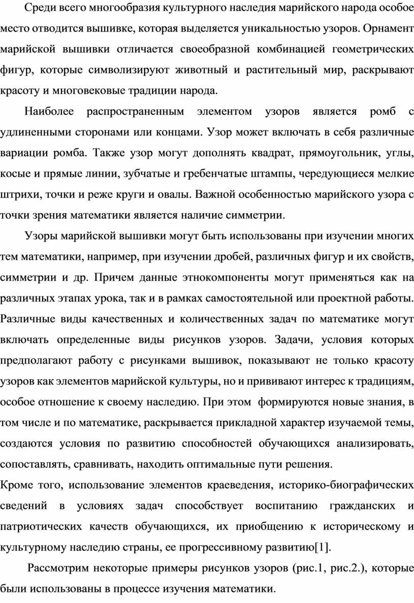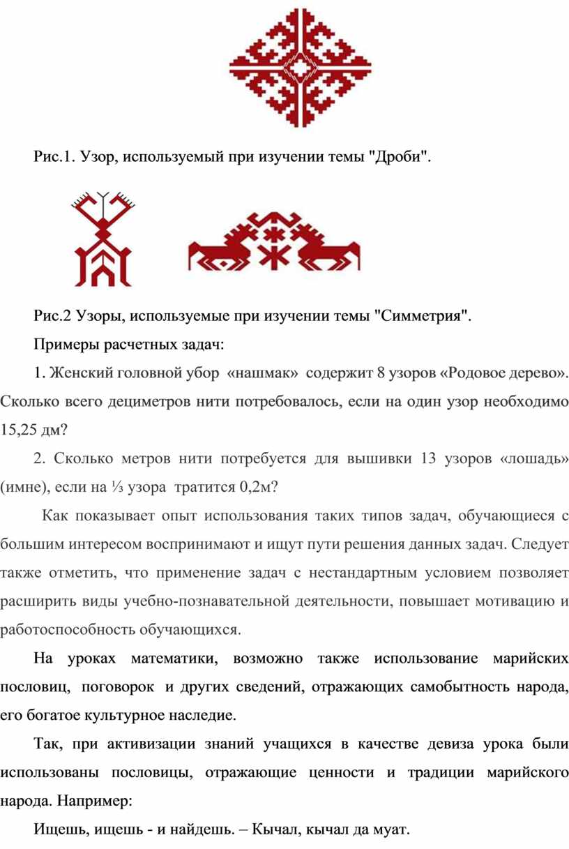Узоры марийской вышивки могут быть использованы при изучении многих тем математики, например, при изучении дробей, различных фигур и их свойств, симметрии и др. Причем данные этнокомпоненты могут применяться как на различных этапах урока, так и в рамках самостоятельной или проектной работы. Различные виды качественных и количественных задач по математике могут включать определенные виды рисунков узоров. Задачи, условия которых предполагают работу с рисунками вышивок, показывают не только красоту узоров как элементов марийской культуры, но и прививают интерес к традициям, особое отношение к своему наследию. При этом формируются новые знания, в том числе и по математике, раскрывается прикладной характер изучаемой темы, создаются условия по развитию способностей обучающихся анализировать, сопоставлять, сравнивать, находить оптимальные пути решения.