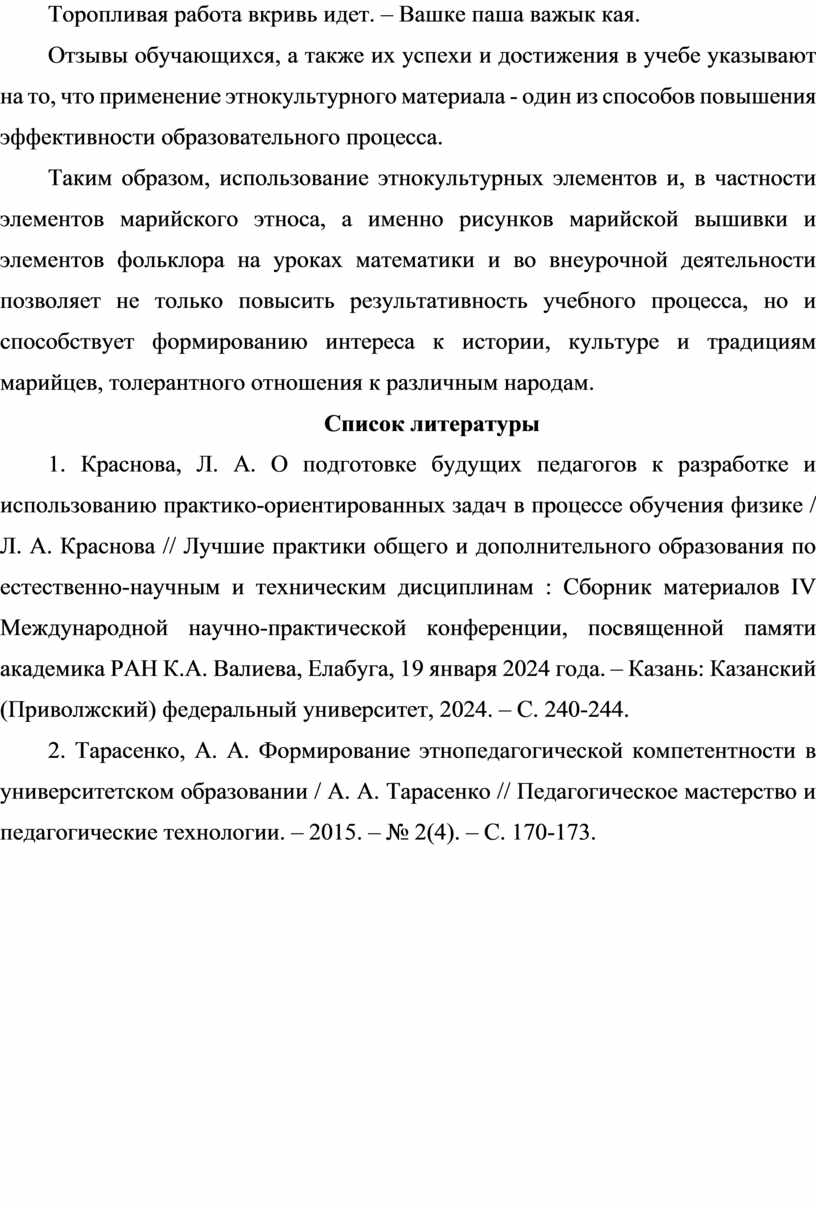 2. Тарасенко, А. А. Формирование этнопедагогической компетентности в университетском образовании / А. А. Тарасенко // Педагогическое мастерство и педагогические технологии. – 2015. – № 2(4). – С. 170-173.