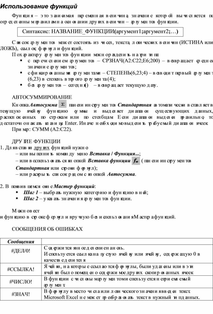 Синтаксис: НАЗВАНИЕ_ФУНКЦИИ(аргумент1;аргумент2;…)