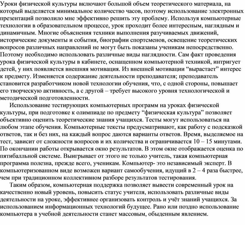 Уроки физической культуры включают большой объем теоретического материала, на который выделяется минимальное количество часов, поэтому использование электронных презентаций позволило мне эффективно решить эту проблему. Используя компьютерные технологии в образовательном процессе, урок проходит более интересным, наглядным и динамичным. Многие объяснения техники выполнения разучиваемых движений, исторические документы и события, биографии спортсменов, освещение теоретических вопросов различных направлений не могут быть показаны ученикам непосредственно. Поэтому необходимо использовать различные виды наглядности. Сам факт проведения урока физической культуры в кабинете, оснащенном компьютерной техникой, интригует детей, у них появляется внешняя мотивация. Из внешней мотивации “вырастает” интерес к предмету. Изменяется содержание деятельности преподавателя; преподаватель становится разработчиком новой технологии обучения, что, с одной стороны, повышает его творческую активность, а с другой – требует высокого уровня технологической и методической подготовленности.