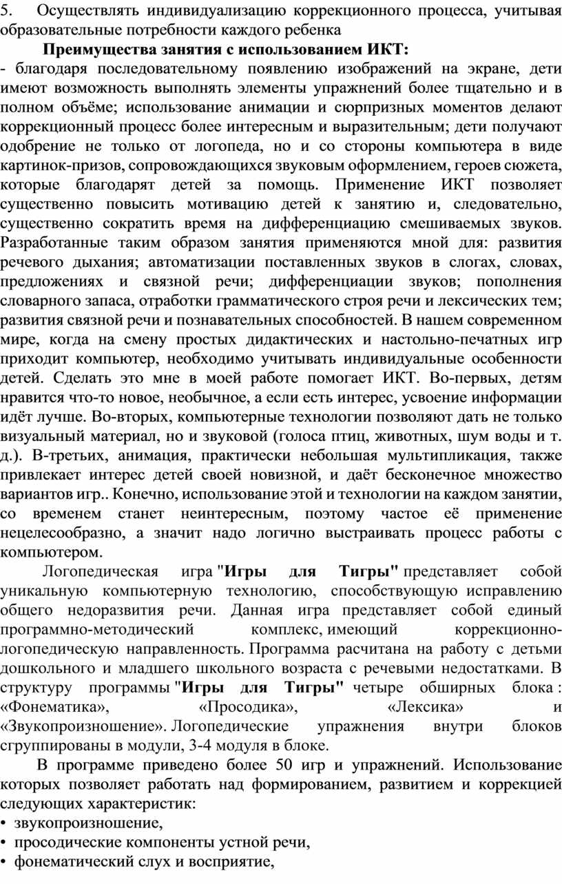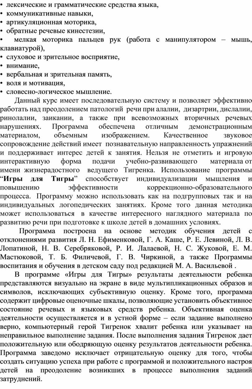 Данный курс имеет последовательную систему и позволяет эффективно работать над преодолением патологий речи при алалии, дизартрии, дислалии, ринолалии, заикании, а также при всевозможных вторичных речевых нарушениях. Программа обеспечена отличным демонстрационным материалом, объемным изображением. Качественное звуковое сопровождение действий имеет познавательную направленность упражнений и поддерживает интерес детей к занятия. Нельзя не отметить и игровую интерактивную форма подачи учебно-развивающего материала от имени жизнерадостного ведущего Тигренка. Использование программы “Игры для Тигры” способствует индивидуализации мышления и повышению эффективности коррекционно-образовательного процесса. Программу можно использовать как на подгрупповых так и на индивидуальных логопедических занятиях. Кроме того данная методика может использоваться в качестве интересного наглядного материала по развитию речи при подготовке к школе детей в домашних условиях.
