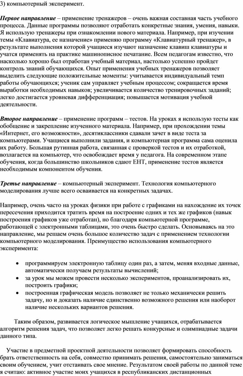 Участие в предметной проектной деятельности позволяет формировать способность брать ответственность на себя, совместно принимать решения, самостоятельно заниматься своим обучением, учит отстаивать свое мнение. Результатом своей работы по данной теме я считаю: активное участие моих учащихся в республиканских дистанционных олимпиадах, международных конкурсах. В перспективе планирую более широкое использование информационных технологий: при разработке обучающих и контролирующих тестов при проектной деятельности учащихся.
