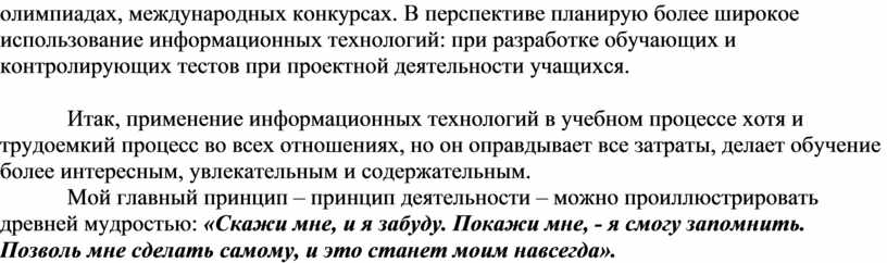 Мой главный принцип – принцип деятельности – можно проиллюстрировать древней мудростью: «Скажи мне, и я забуду. Покажи мне, - я смогу запомнить. Позволь мне сделать самому, и это станет моим навсегда».