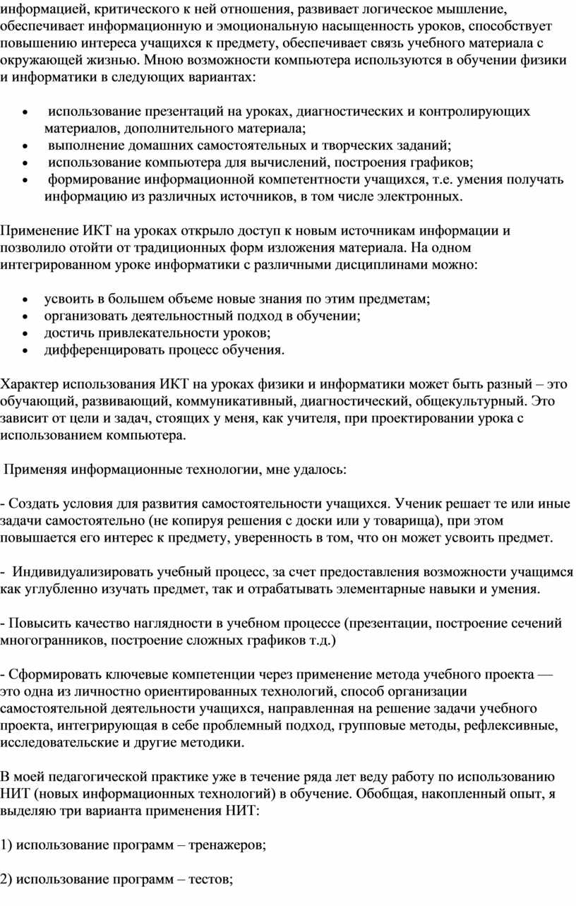 В моей педагогической практике уже в течение ряда лет веду работу по использованию НИТ (новых информационных технологий) в обучение. Обобщая, накопленный опыт, я выделяю три варианта применения НИТ: