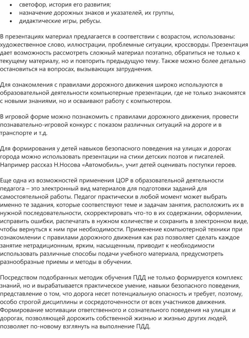 Еще одна из возможностей применения ЦОР в образовательной деятельности педагога – это электронный вид материалов для подготовки заданий для самостоятельной работы. Педагог практически в любой момент может выбрать именно те задания, которые соответствуют теме и задачам занятия, расположить их в нужной последовательности, скорректировать что-то в их содержании, оформлении, исправить ошибки, распечатать в нужном количестве и сохранить в электронном виде, чтобы вернуться к ним при необходимости. Применение компьютерной техники при ознакомлении с правилами дорожного движения как раз позволяет сделать каждое занятие нетрадиционным, ярким, насыщенным, приводит к необходимости использовать различные способы подачи учебного материала, предусмотреть разнообразные приемы и методы в обучении.
