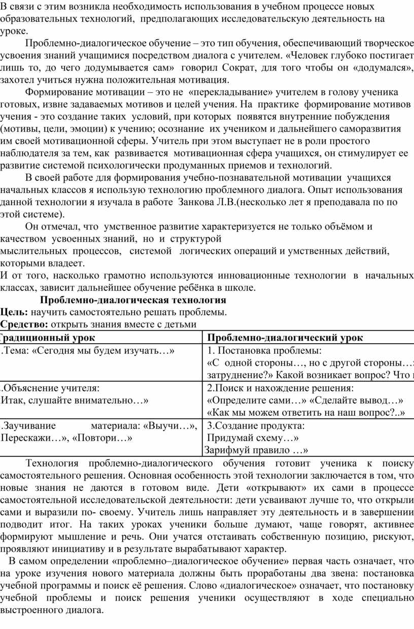 В своей работе для формирования учебно-познавательной мотивации учащихся начальных классов я использую технологию проблемного диалога. Опыт использования данной технологии я изучала в работе Занкова Л.В.(несколько лет я преподавала по по этой системе).