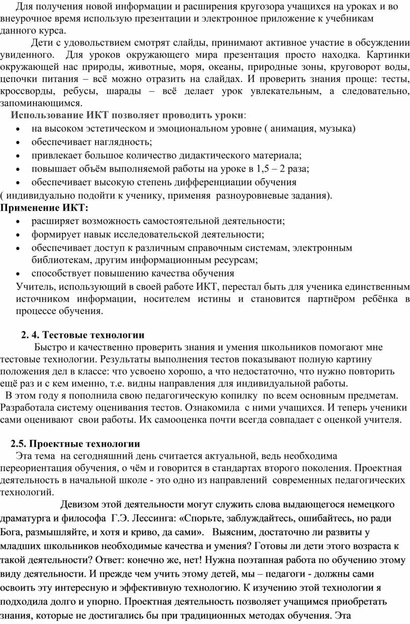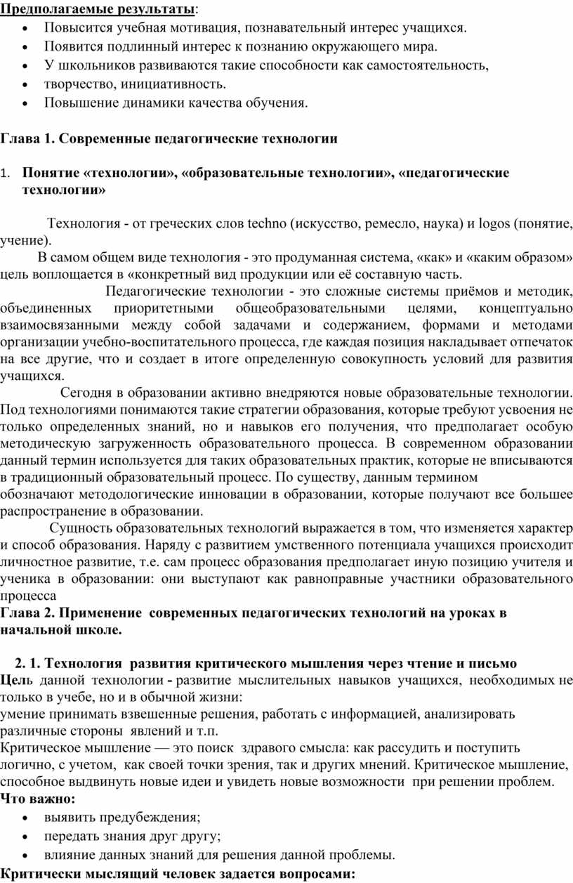 Глава 2. Применение современных педагогических технологий на уроках в начальной школе.