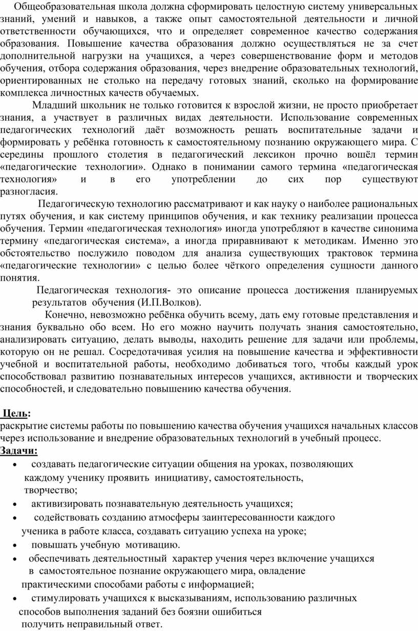 раскрытие системы работы по повышению качества обучения учащихся начальных классов через использование и внедрение образовательных технологий в учебный процесс.