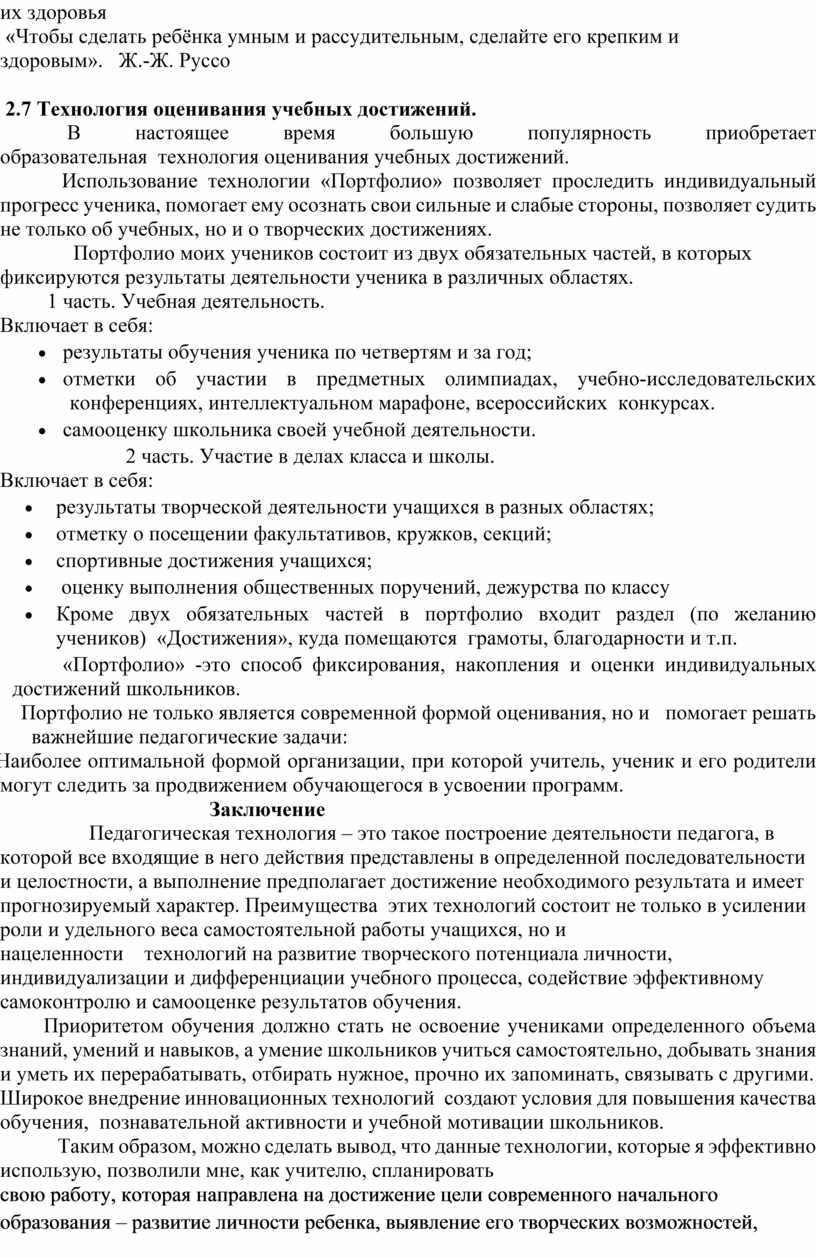 Использование технологии «Портфолио» позволяет проследить индивидуальный прогресс ученика, помогает ему осознать свои сильные и слабые стороны, позволяет судить не только об учебных, но и о творческих достижениях.