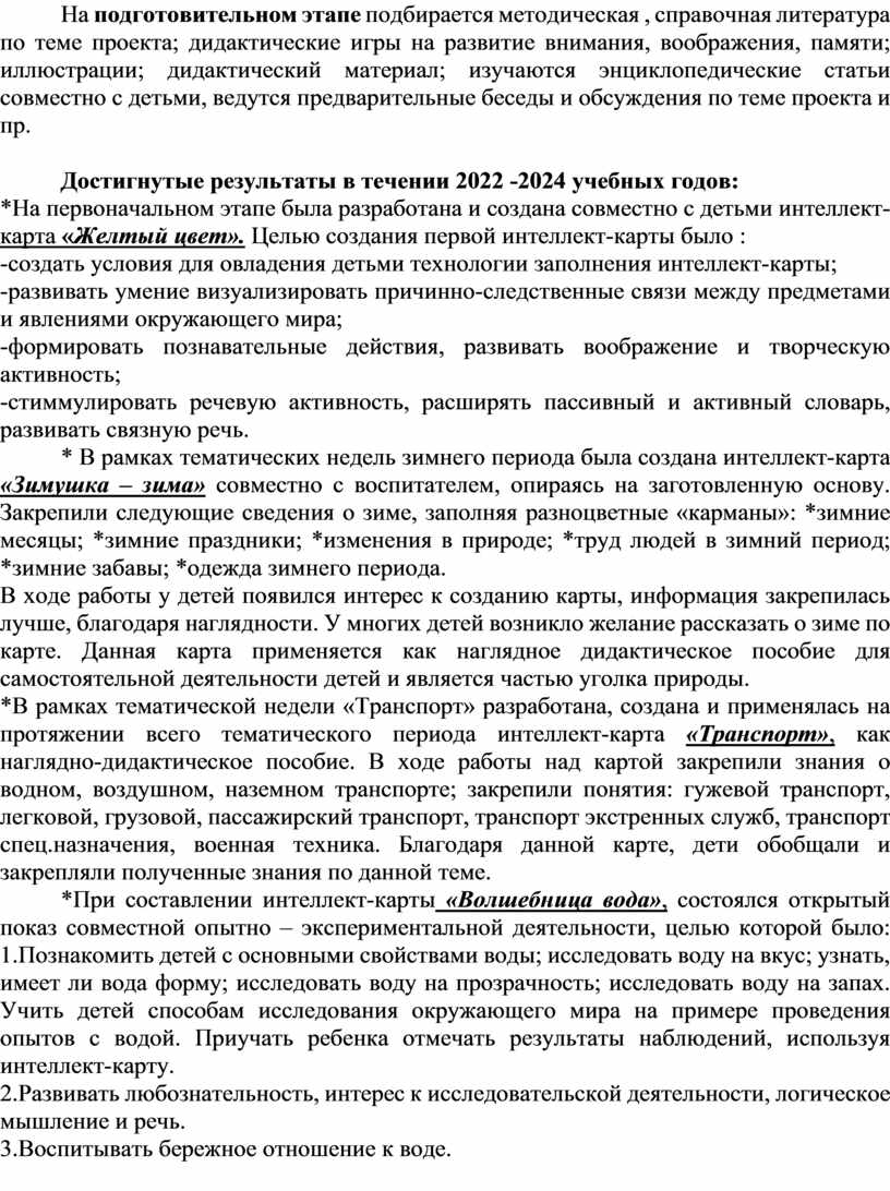 Итог работы: в результате систематического использования технологии создания интеллект-карт была отмечена возросшая детская активность, инициативность, самостоятельность в проявлении любознательности и познавательного поиска. Дети приобрели определенные умения по созданию интеллект-карт, зачатки планирования, которые они проявляют в самостоятельной и совместной деятельности, в повседневной жизни.