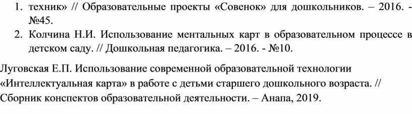 6. Луговская Е.П. Использование современной образовательной технологии «Интеллектуальная карта» в работе с детьми старшего дошкольного возраста. // Сборник конспектов образовательной деятельности. – Анапа, 2019.