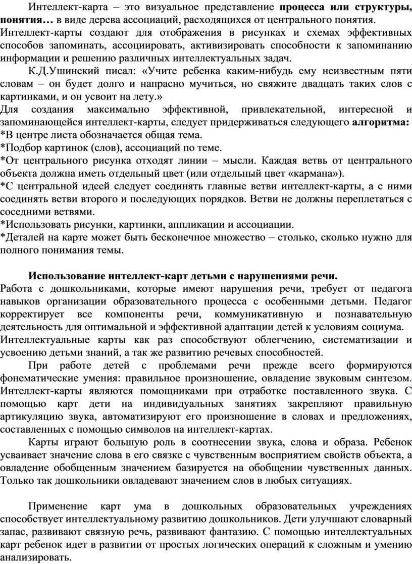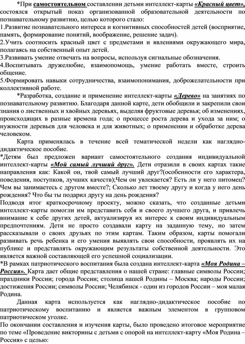 Применение карт ума в дошкольных образовательных учреждениях способствует интеллектуальному развитию дошкольников. Дети улучшают словарный запас, развивают связную речь, развивают фантазию. С помощью интеллектуальных карт ребенок идет в развитии от простых логических операций к сложным и умению анализировать.