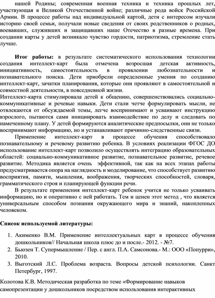 4. Колотова К.В. Методическая разработка по теме «Формирование навыков самопрезентации у дошкольников посредством использования интерактивных техник» // Образовательные проекты «Совенок» для дошкольников. – 2016. - №45.