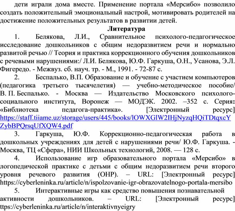4. Использование игр образовательного портала «Мерсибо» в логопедической практике с детьми с общим недоразвитием речи второго уровня речевого развития (ОНР). – URL: [Электронный ресурс] https://cyberleninka.ru/article/n/ispolzovanie-igr-obrazovatelnogo-portala-mersibo