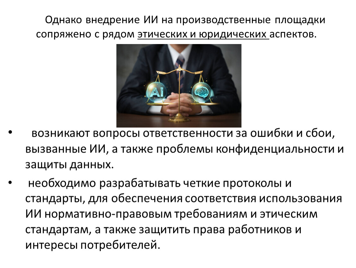 Однако внедрение ИИ на производственные площадки сопряжено с рядом этических и юридических аспектов.