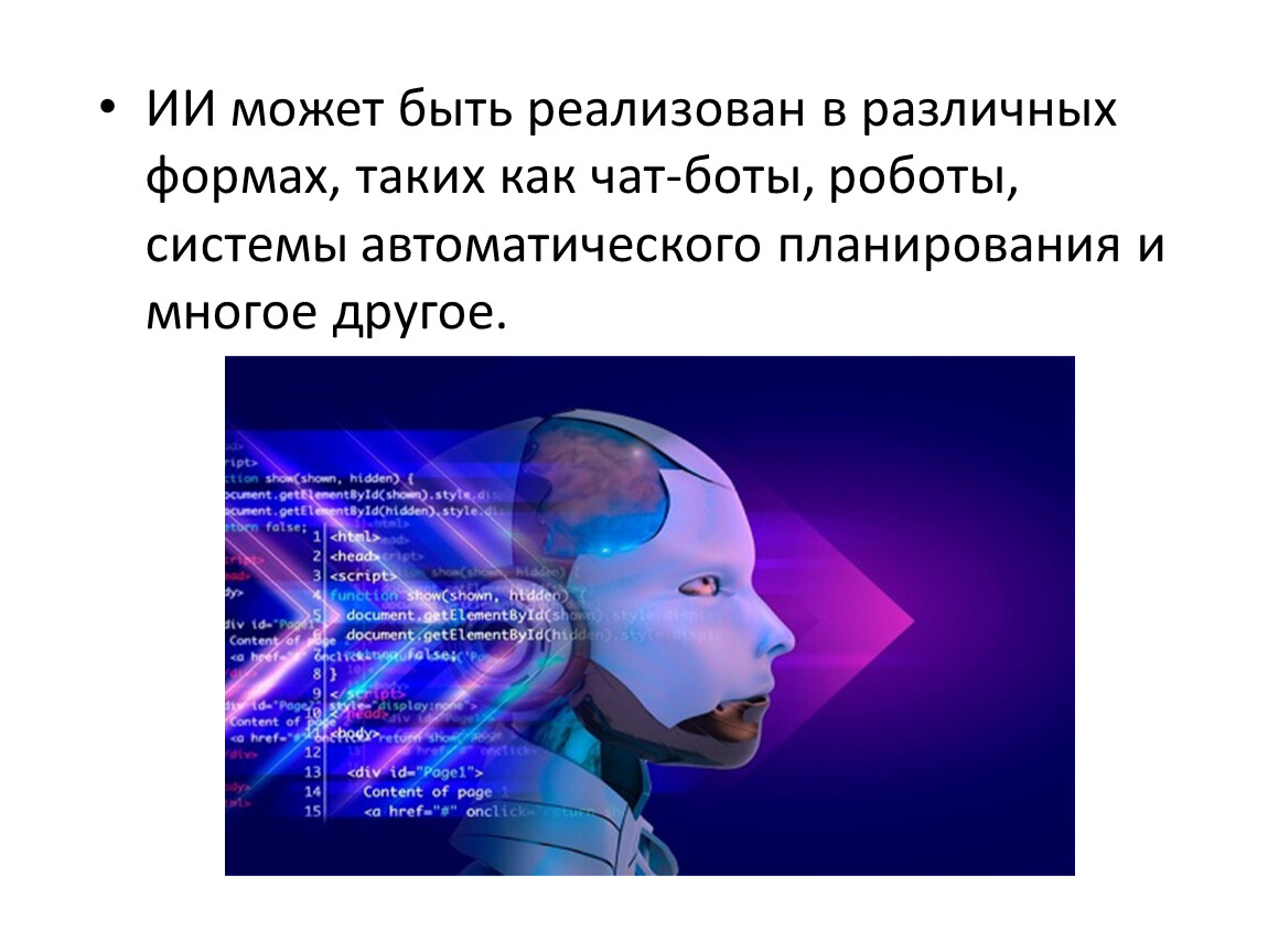 ИИ может быть реализован в различных формах, таких как чат-боты, роботы, системы автоматического планирования и многое другое.