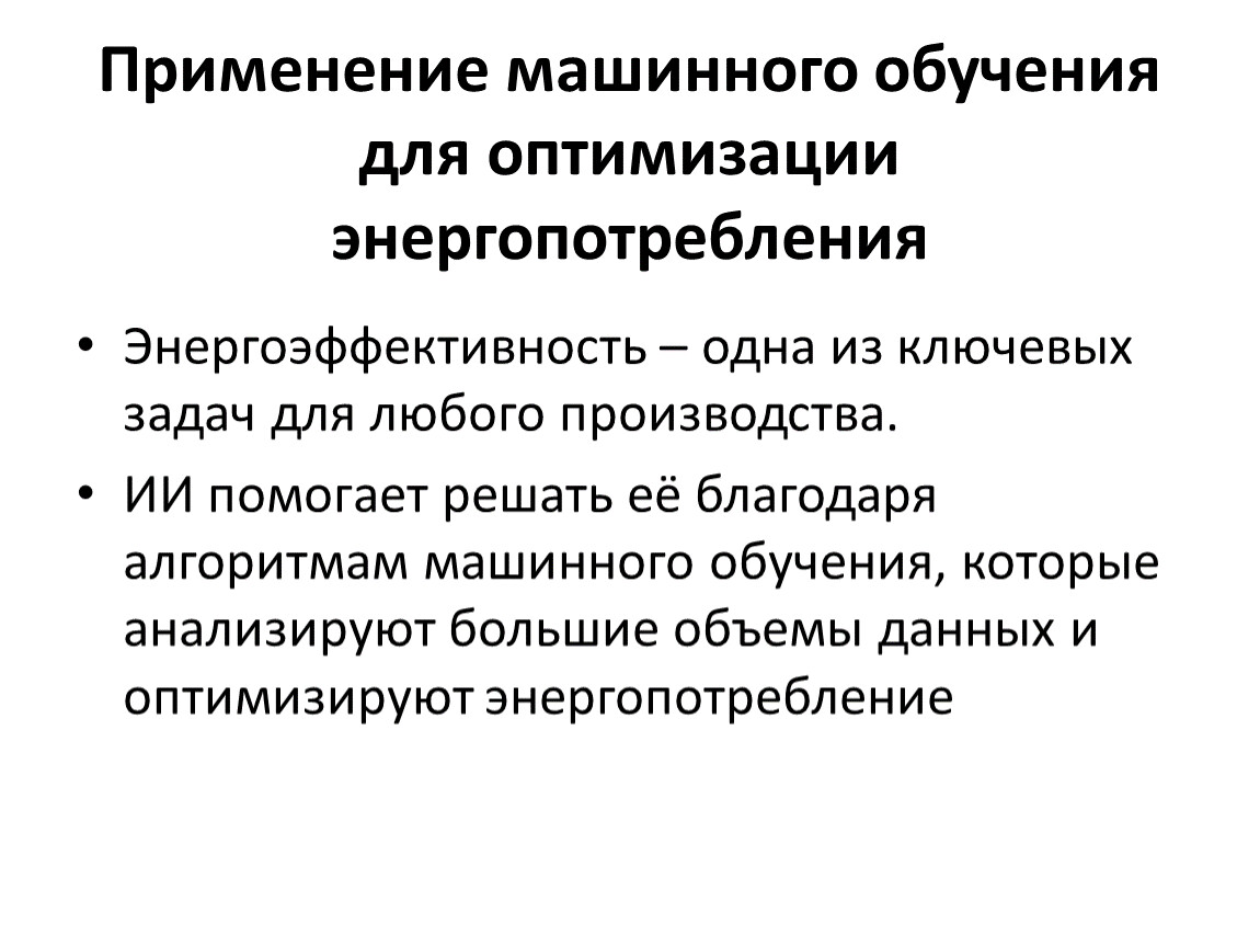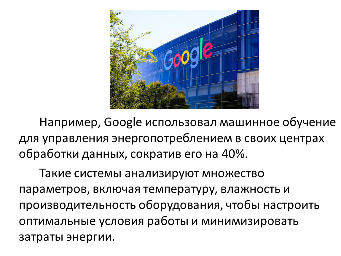 Например, Google использовал машинное обучение для управления энергопотреблением в своих центрах обработки данных, сократив его на 40%.