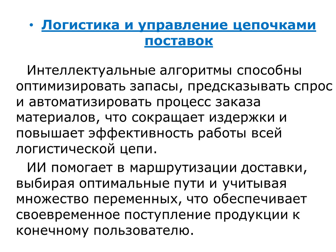 Оптимизация логистических цепочек с помощью предсказательного анализа, что позволяет компаниям сократить издержки и увеличить скорость доставки.
