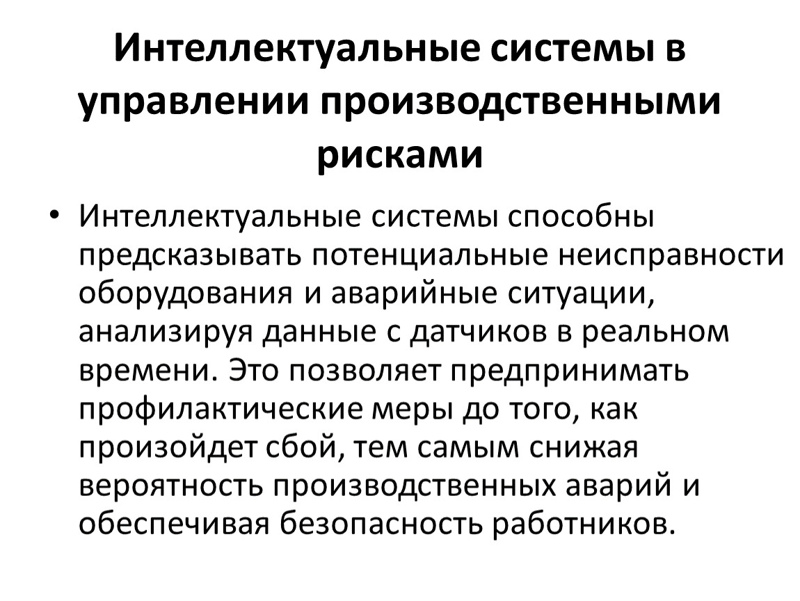 Интеллектуальные системы способны предсказывать потенциальные неисправности оборудования и аварийные ситуации, анализируя данные с датчиков в реальном времени. Это позволяет предпринимать профилактические меры до того, как произойдет сбой, тем самым снижая вероятность производственных аварий и обеспечивая безопасность работников.