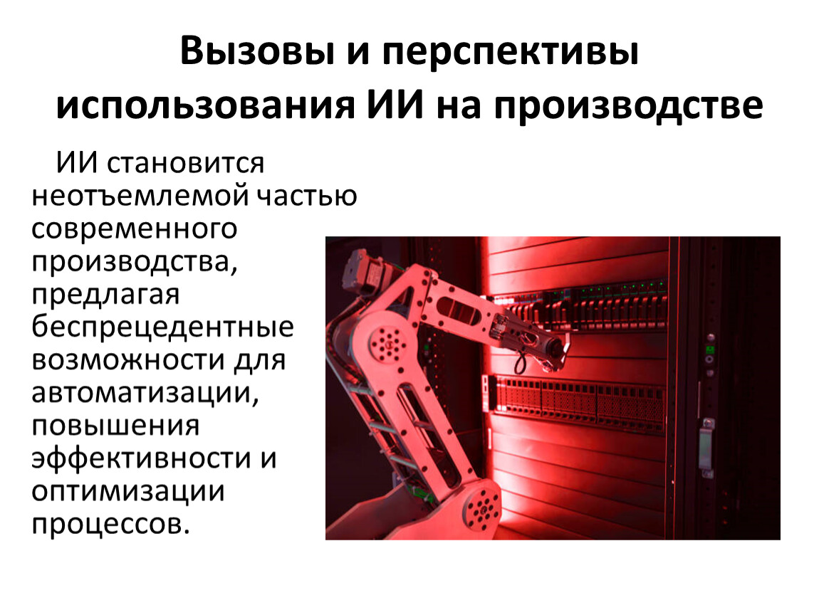 ИИ становится неотъемлемой частью современного производства, предлагая беспрецедентные возможности для автоматизации, повышения эффективности и оптимизации процессов.
