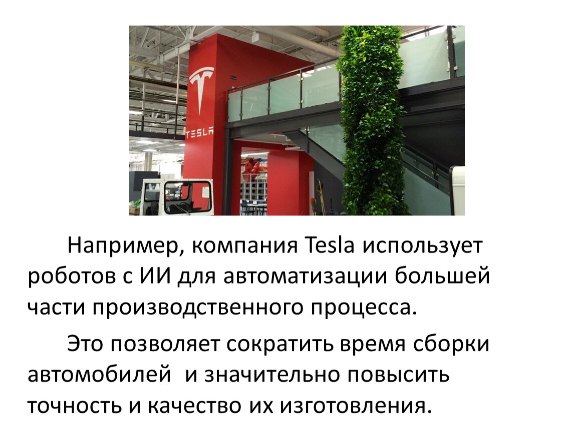 Например, компания Tesla использует роботов с ИИ для автоматизации большей части производственного процесса.