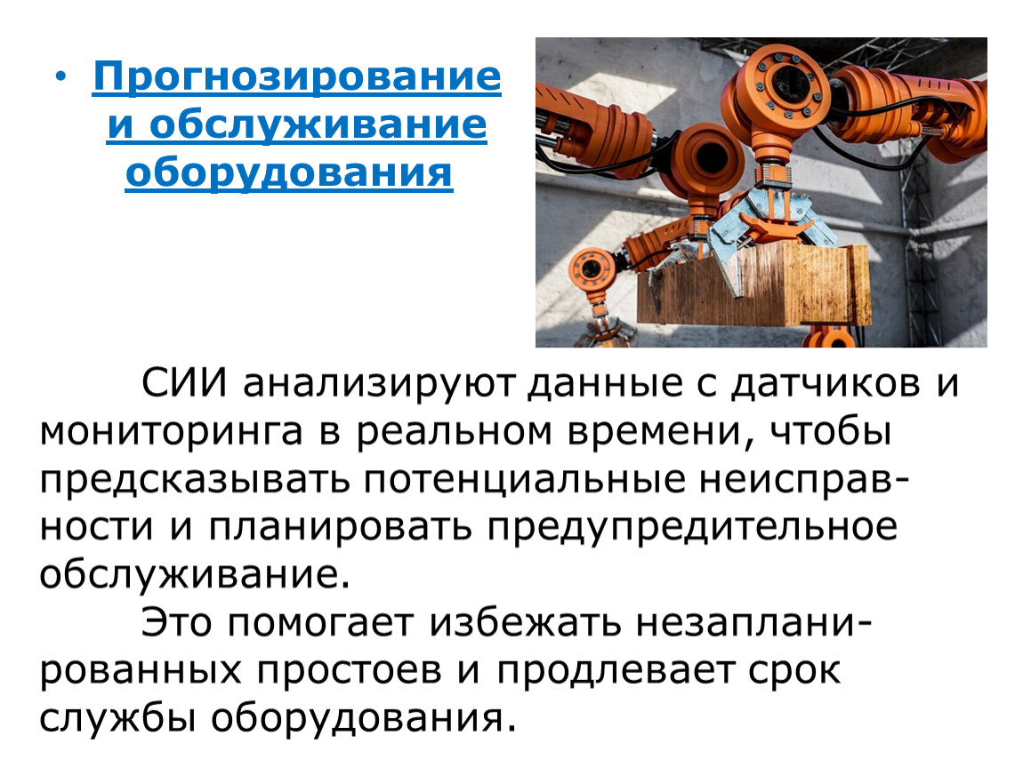 СИИ анализируют данные с датчиков и мониторинга в реальном времени, чтобы предсказывать потенциальные неисправ-ности и планировать предупредительное обслуживание.