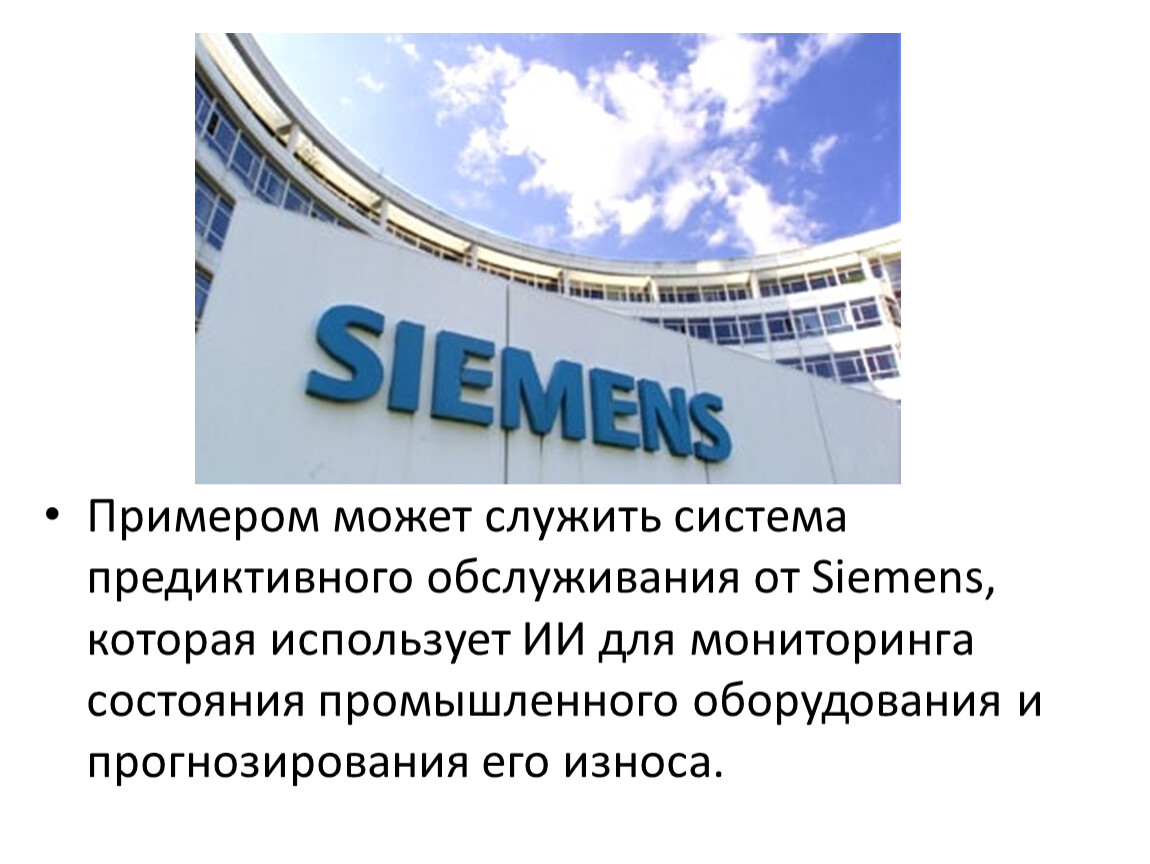 Примером может служить система предиктивного обслуживания от Siemens, которая использует ИИ для мониторинга состояния промышленного оборудования и прогнозирования его износа.