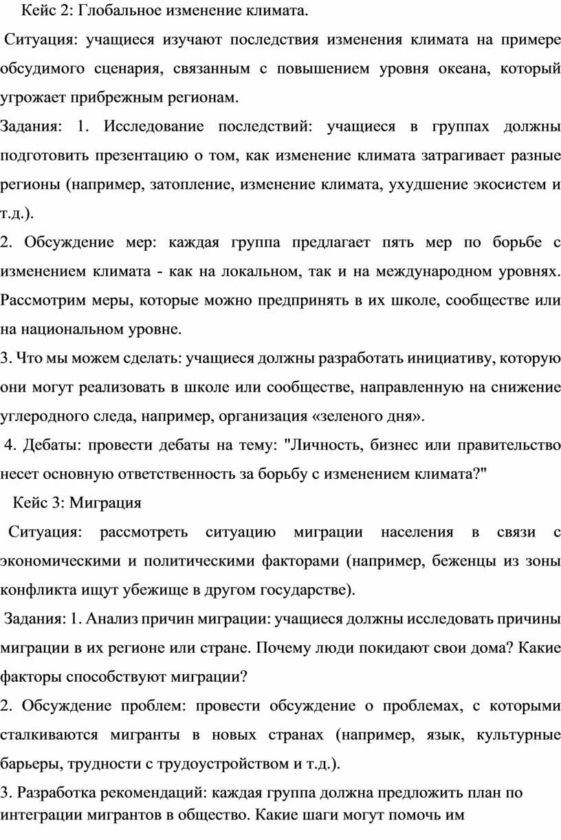 Для каждого кейса важно следить за вовлеченностью учащихся, давать им возможность активно участвовать в обсуждениях и решения задач. Также рекомендуется, чтобы учитель помогал направлять дискуссии и подчеркивали важность глобальных компетенций в понимании и решении актуальных мировых проблем.