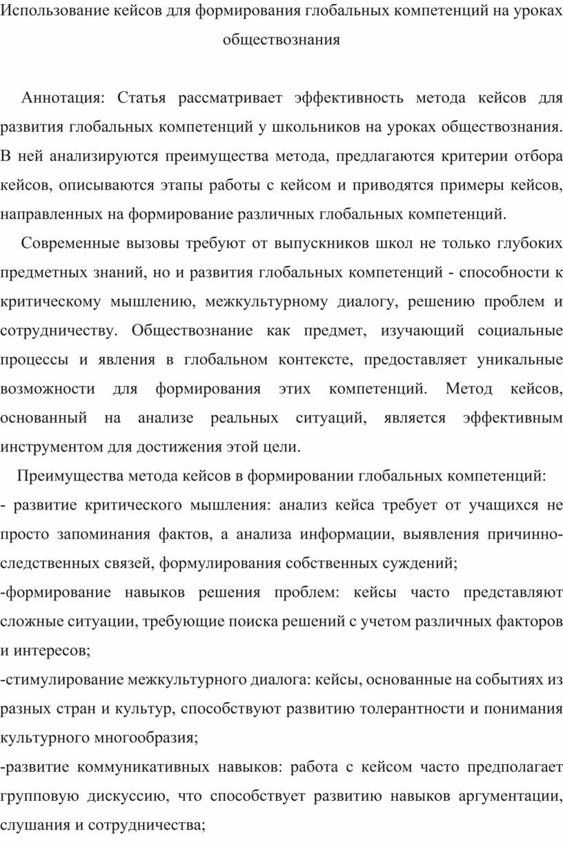 Современные вызовы требуют от выпускников школ не только глубоких предметных знаний, но и развития глобальных компетенций - способности к критическому мышлению, межкультурному диалогу, решению проблем и сотрудничеству. Обществознание как предмет, изучающий социальные процессы и явления в глобальном контексте, предоставляет уникальные возможности для формирования этих компетенций. Метод кейсов, основанный на анализе реальных ситуаций, является эффективным инструментом для достижения этой цели.