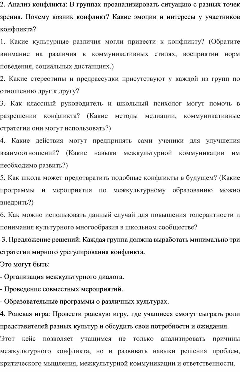 Кейс 1: Межкультурный конфликт: В многонациональном городе произошел конфликт между представителями двух культурных групп, например, из-за различий в традициях и обычаях.
