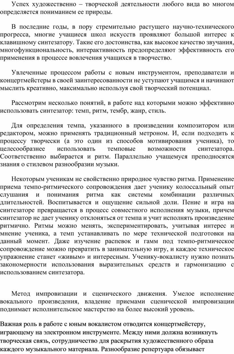 Некоторым ученикам не свойственно природное чувство ритма. Применение приема темпо-ритмического сопровождения дает ученику колоссальный опыт слушания и понимания ритма как системы комбинации различных длительностей. Воспитывается и ощущение сильной доли. Пение и игра на синтезаторе превращается в процесс совместного исполнения музыки, причем синтезатор не дает ученику отклоняться от темпа и учит исполнять произведение ритмично. Ритмы можно менять, экспериментировать, учитывая интерес и мнение ученика, а темп устанавливать по мере технической подготовки на данный момент. Даже изучение распевок и гамм под темпо-ритмическое сопровождение можно превратить в занимательную игру, и каждое техническое упражнение станет «живым» и интересным. Ученику-вокалисту нужно познать закономерности использования выразительных средств и гармонизацию с использованием синтезатора.